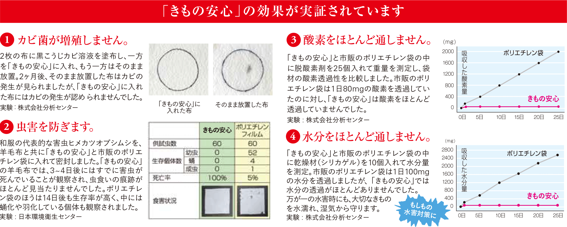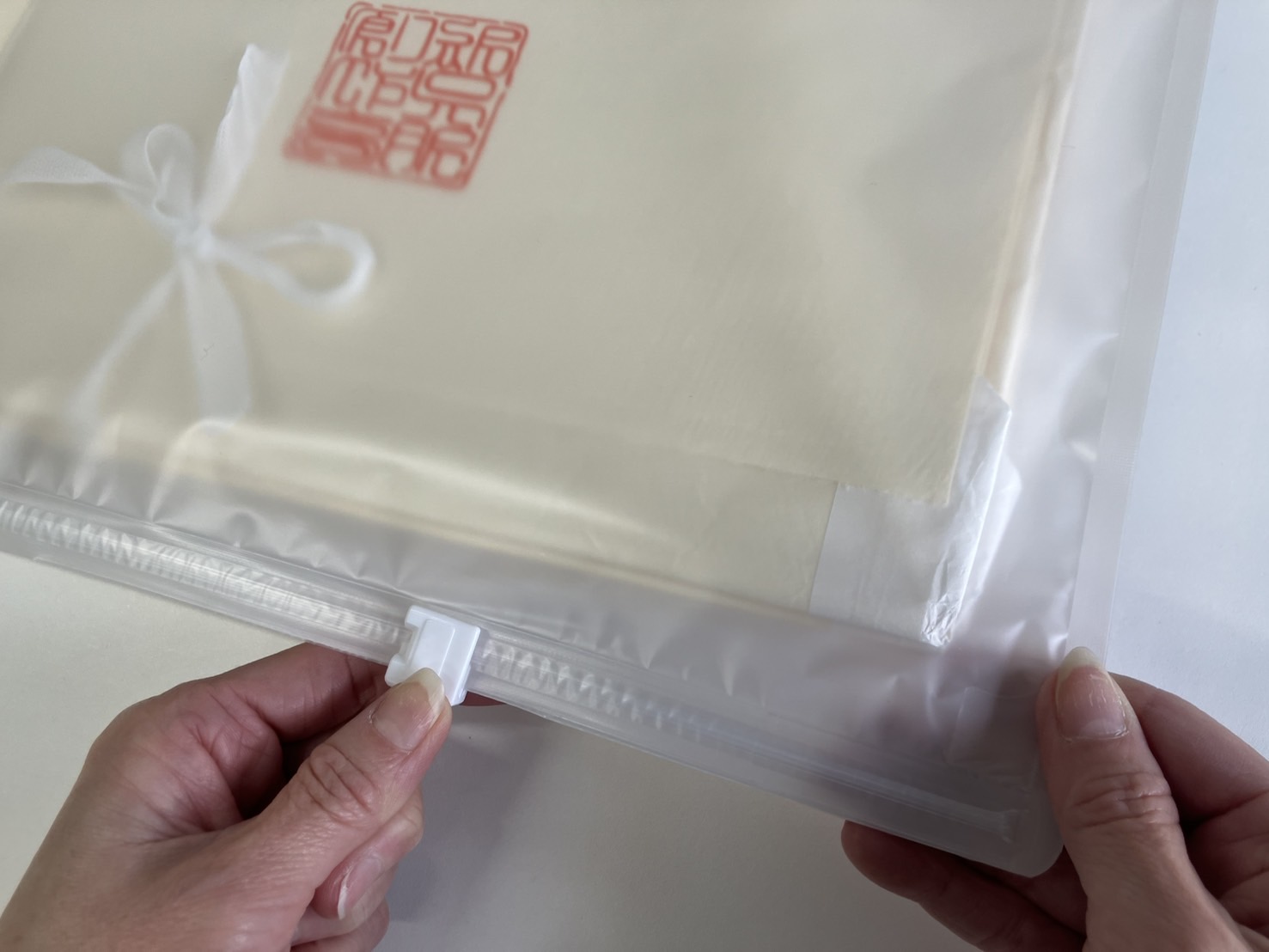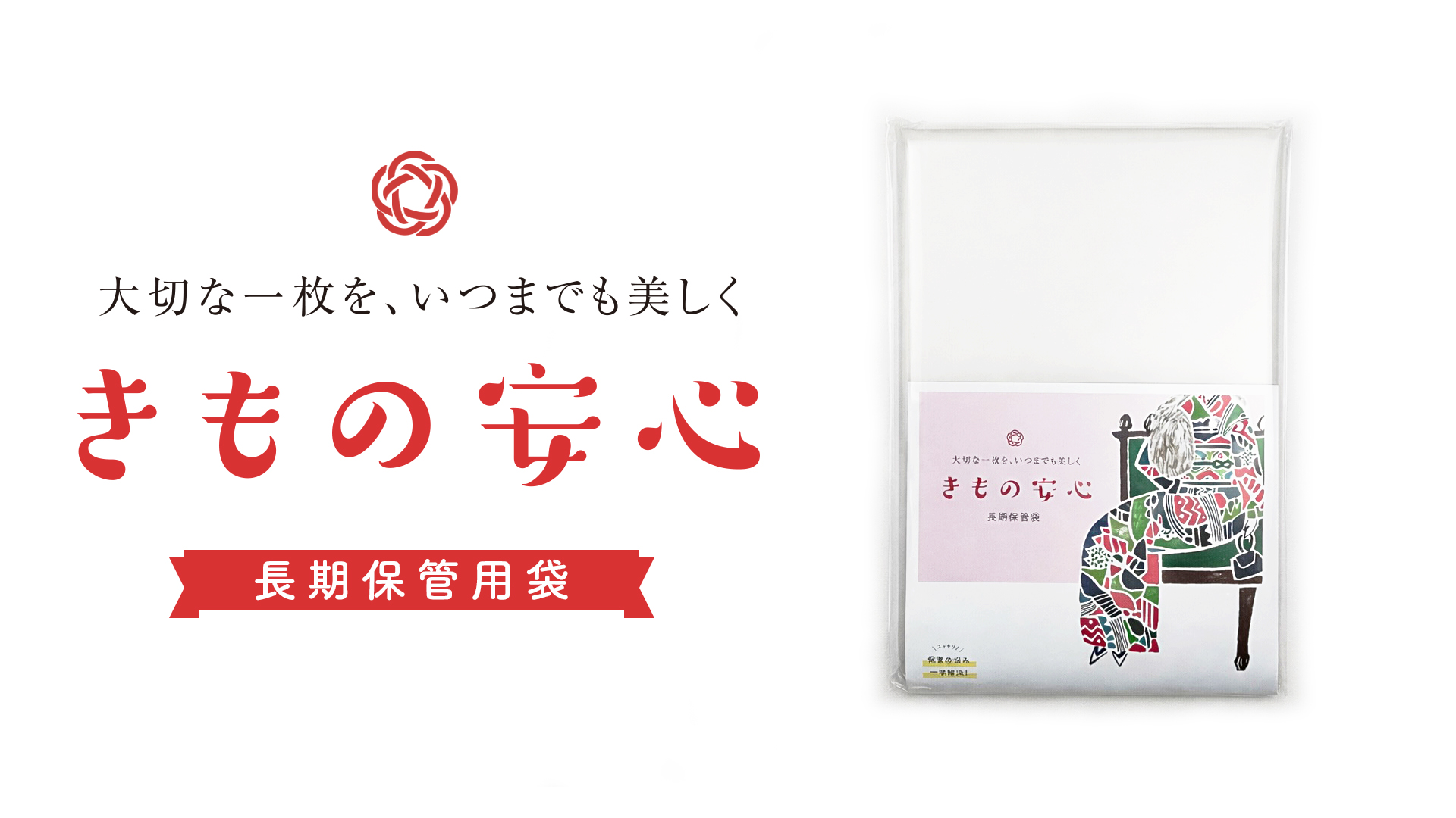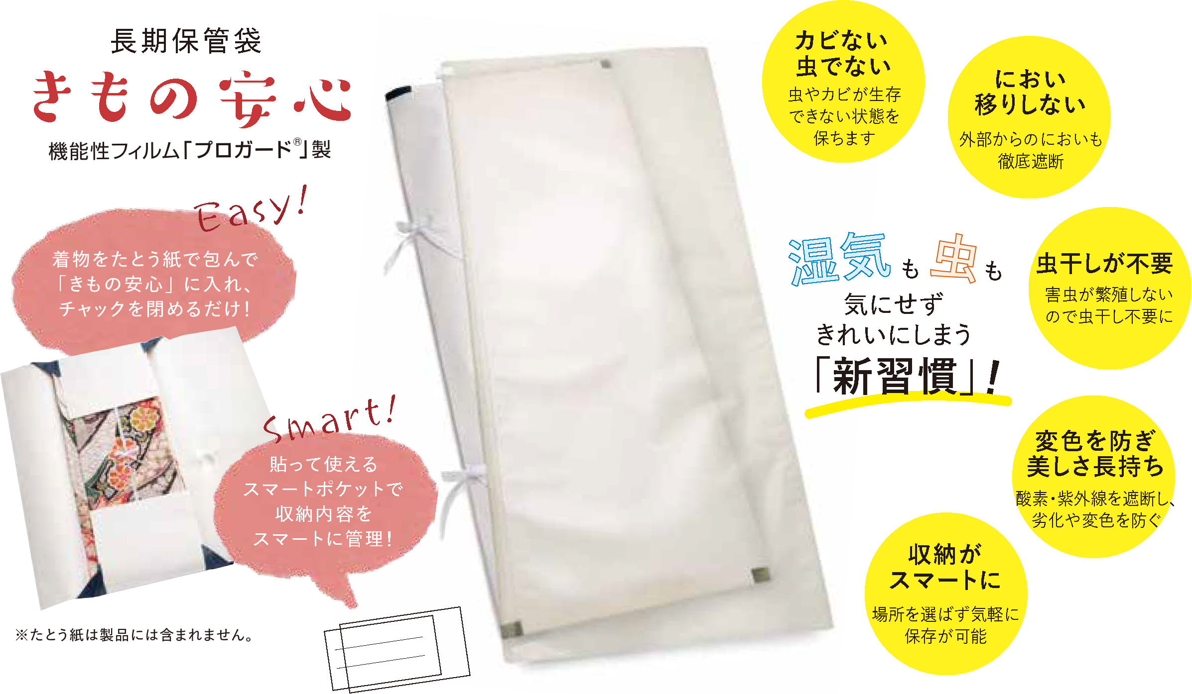 きもの安心は、たとう紙のままこの袋に入れ、中の空気を抜きながらチャックを閉じるだけで、きものを長期保管の事故からまもります。