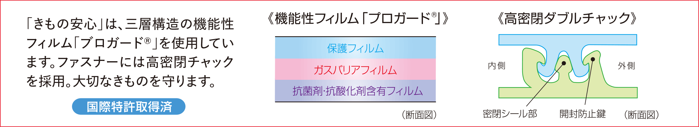 国際特許取得済みの特殊な3層構造と高密閉ダブルチャックで、長期保管事故の原因となる、ガスの侵入を防ぎ、カビからも、虫からも、湿気からも、大切なものを安全に守ります。